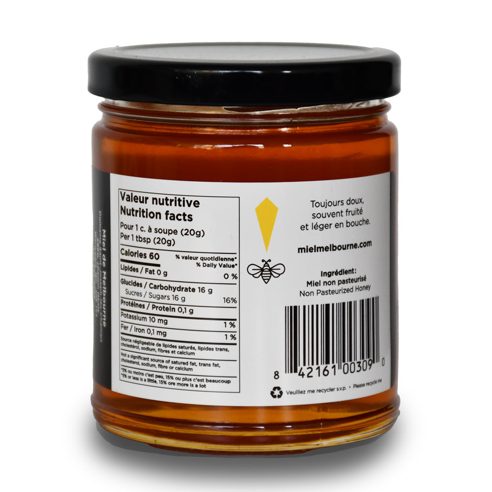 Le miel Parfum d’Été Miel De Melbourne est récolté durant la floraison estivale du Québec, capturant la douceur naturellement légère et fruitée des fleurs de début d’été. Brut et non pasteurisé, il offre une finale douce et délicate, rehaussée d’une subtile luminosité florale — une véritable expression du nectar le plus frais de la saison.