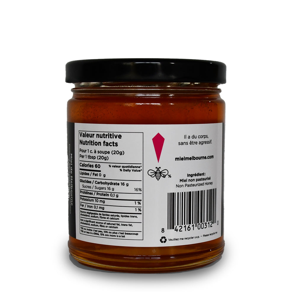 Miel De Melbourne Wildflower Honey is crafted from beehives embraced by Québec’s vibrant wild blooms, offering a naturally smooth, floral, and gently mature taste. This raw, unpasteurized honey preserves its full spectrum of natural enzymes, antioxidants, and refined floral notes for an authentic wildflower honey experience.
